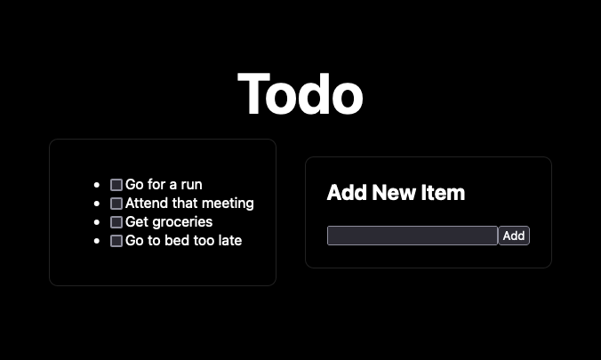 // Import the page and head components as well as the default style sheet. import type { NextPage } from 'next' import Head from 'next/head' import styles from '../styles/Home.module.css' // Import the React module for handling state variables. import { useState } from 'react' // Create the page, using the NextPage type. const Todo: NextPage = () => { // Initialize the state variables and their set functions. // This example uses a static initial todo list, but you could instead have // the application load the todo list from a database on page load using // the useEffect module from React. const [todoList, setTodoList] = useState([ 'Go for a run', 'Attend that meeting', 'Get groceries', 'Go to bed too late' ]) const [newTodoItem, setNewTodoItem] = useState('') // Provide a function to add a new item to the todo list. const addTodoItem: void = () => { // Create a new version of the list with the new item added, then set the // todo list state variable to the new list. const newTodoList = todoList.concat(newTodoItem) setTodoList(newTodoList) } // Provide a function to mark a todo item completed, removing the item from // the list. const markTodoItem: void = (markedItem, isMarked) => { // Make sure that the user has marked the item for removal. if (isMarked) { // Create a new version of the list filtering out the marked item, then // set the todo list state variable to the new list. const newTodoList = todoList.filter(e => e !== markedItem) setTodoList(newTodoList) } } // Define the page's HTML structure. This includes a mapping function to // loop through the todo list items and create an li element for each with // the todo item text and a checkbox for marking it complete. return ( <div className={styles.container}> <Head> <title>Example Next App | Todo List</title> <meta name="description" content="Generated by create next app" /> <link rel="icon" href="/favicon.ico" /> </Head> <main className={styles.main}> <h1 className={styles.title}> Todo </h1> <div className={styles.grid}> <div className={styles.card}> <ul> {todoList.map((todoItem) => ( <li key={todoItem}> <input type="checkbox" onChange={ (e) => markTodoItem(todoItem, e.target.checked) } /> <span>{todoItem}</span> </li> ))} </ul> </div> <div className={styles.card}> <h2>Add New Item</h2> <p> <input type="text" onChange={ (e) => { setNewTodoItem(e.target.value) } } /> <button onClick={addTodoItem}>Add</button> </p> </div> </div> </main> </div> ) } // Export the page for processing and display. export default Todo